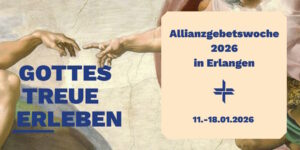 - Allianz-Gebetswoche 202611. – 18. Januar 2026. Erlanger Christen beten gemeinsam an verschiedenen Orten in Erlangen. Start am Sonntag 11.01. 10:00 mit einem gemeinsamen Gottesdienst in der EFG (Baptisten).